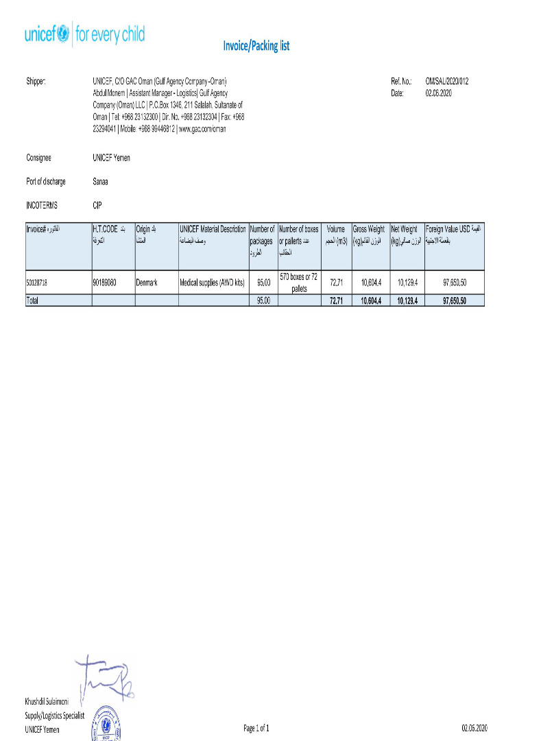 وصلت إلى مطار صنعاء اليوم المساعدات الطبية المقدمة من منظمة اليونيسيف وذلك لمكافحة تفشي وباء كورونا المستجد كوفيد 19 وتشمل معدات الوقاية مثل الأقنعة طبية والقفازات والبدلات الطبية الواقية للعاملين في المجال الطبي الذين يحشدون جهودهم والذين يقفون في الصفوف الأمامية في مكافحة هذا الوباء.